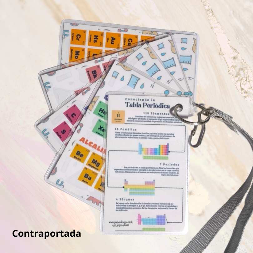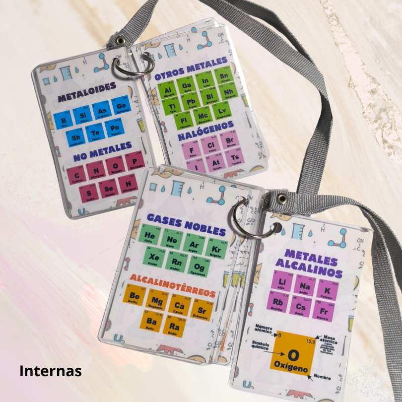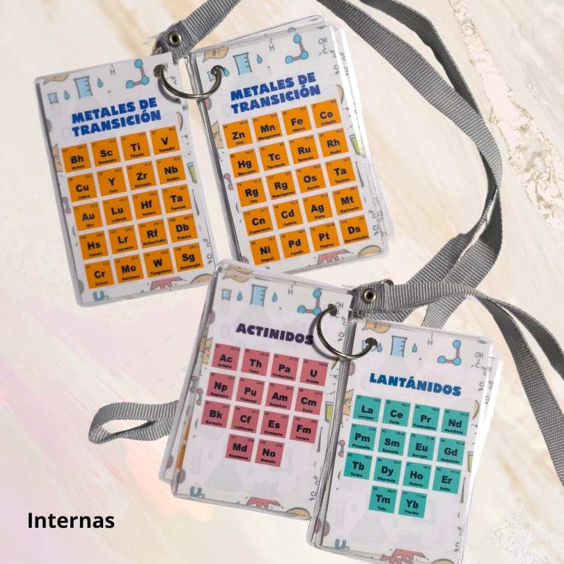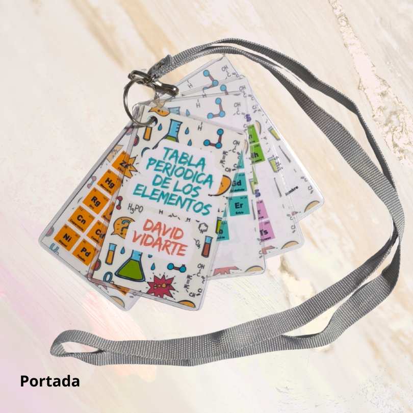 Llavero de la Tabla periódica de los elementos químicos, 5 fichas laminadas resistentes al agua con llavero y cinta unicolor variada, escogida según disponibilidad o existencia.